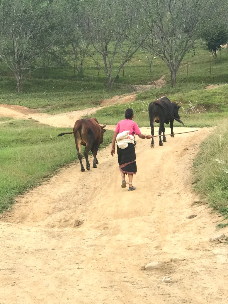 I am so happy to be out of the city and in the country. I cannot describe the feeling of waking up to views of mist passing along the mountains. There are cows and goats everywhere and endless rice terraces. It’s very lush here and this town is so full of life. I took a walk to the village and got to walk two cows with an elderly Nepali woman! Eighty percent of the people here are Hindu. We visited the local temple that is more than 1000 years old. Every Saturday sacrifices are made of chickens and goats.